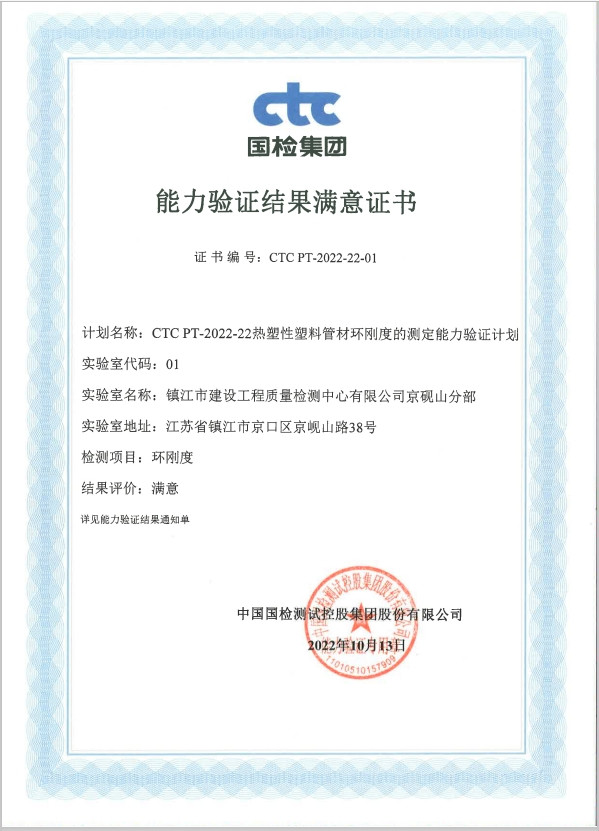 2022年8月,检测中心参加了中国国检测试控股集团股份有限公司组织的“CTC PT-2022-22热塑性塑料管材环刚度的测定能力验证计划”,近期收到能力验证结果通知单,我中心提交的检测结果评价为“满意”,顺利取得了能力验证结果满意证书。