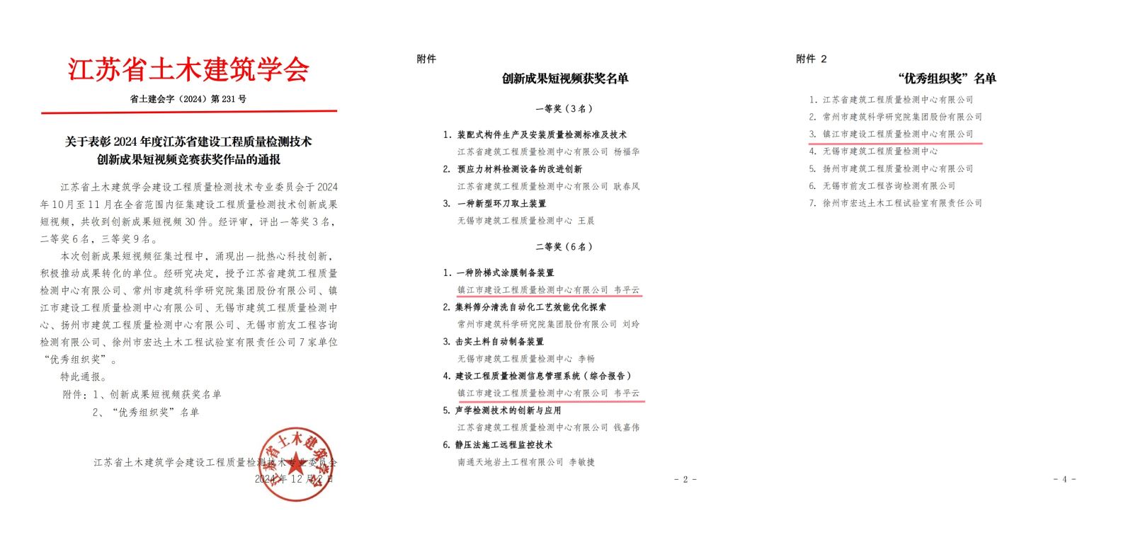 近日,在2024年度江苏省土木建筑学会建设工程质量检测技术创新成果短视频竞赛中,检测中心积极参加、精心准备,以此契机对外展示中心自主研发并已投入使用的创新成果。其中,韦平云同志制作的一种阶梯式涂膜制备设备建设工程质量检测信息管理系统(综合报告)创新成果短视频从30件余件作品中脱颖而出,荣获两项短视频竞赛二等奖。同时,检测中心荣获优秀组织奖