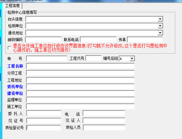 优点:每个施工单位只负责本单位的相关委托信息,减少信息填写错误的情况发生。 注意: 该软件中工程信息是需要检测中心录入的,工程信息必须先在检测中心的检测软件中录入,然后把检测软件里该工程的相关信息录入到该软件里的工程信息里,账号和工程代号必须和检测软件里一致。